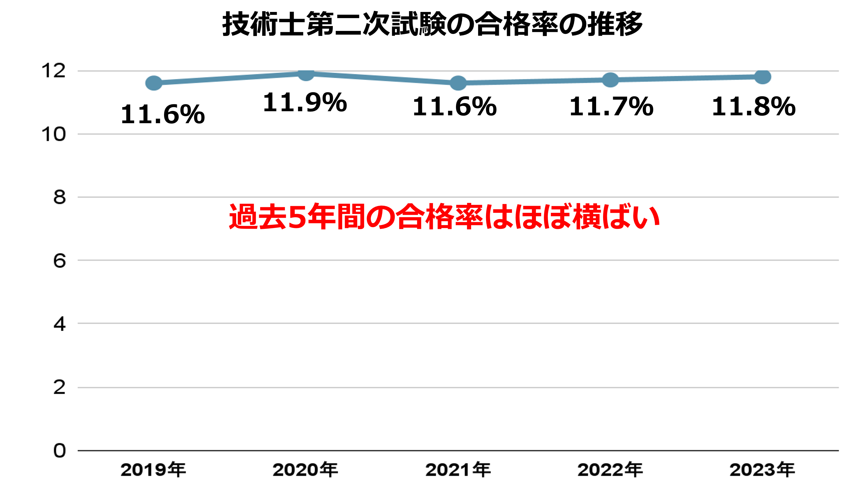 過去5年(2019~2023年)の技術士第試験の合格率を見ると、11%台をキープしており、ほぼ横ばいの状態です。
