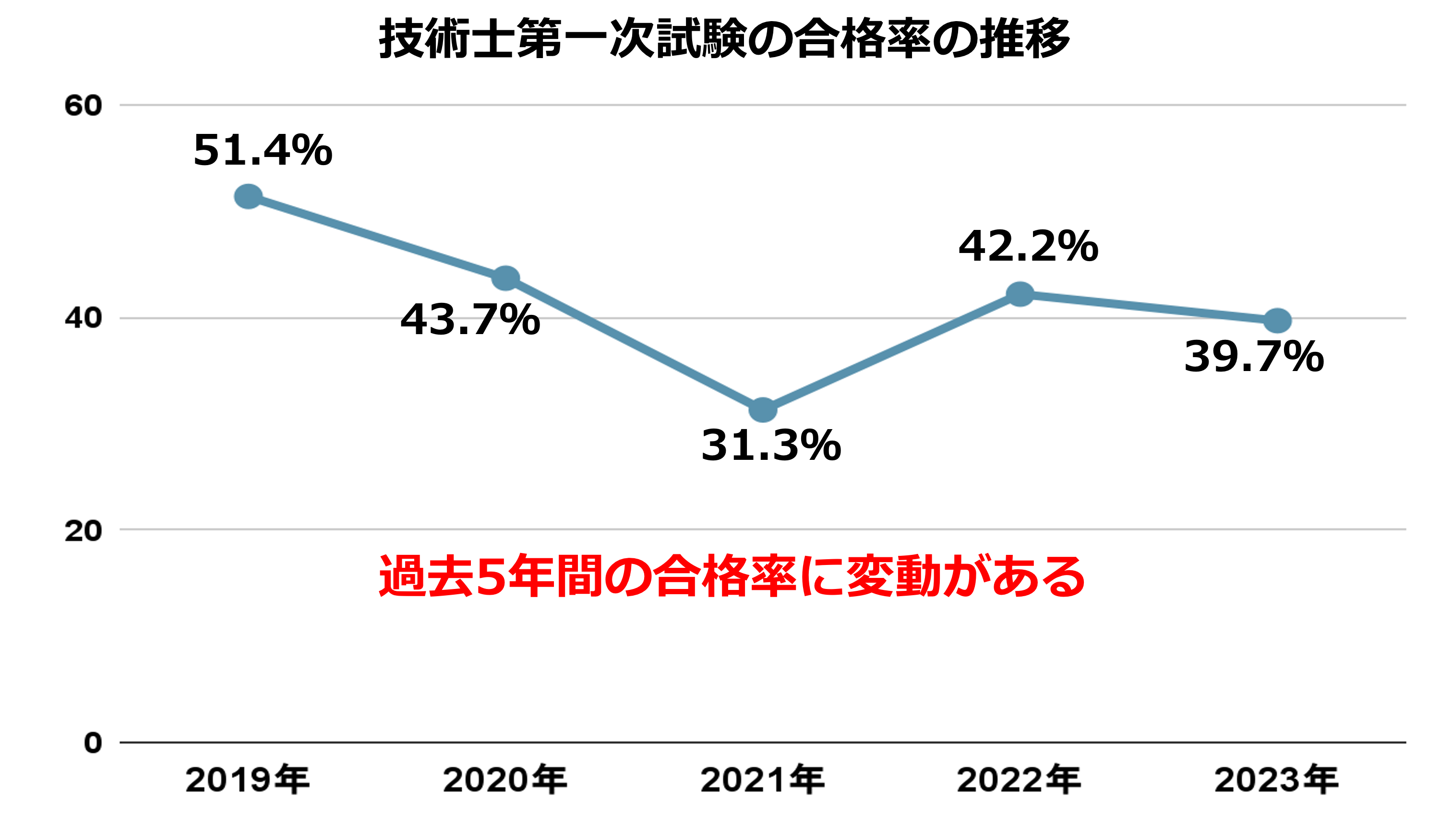 毎年の問題の傾向や受験者の勉強具合が、合格率を左右していると考えられます。