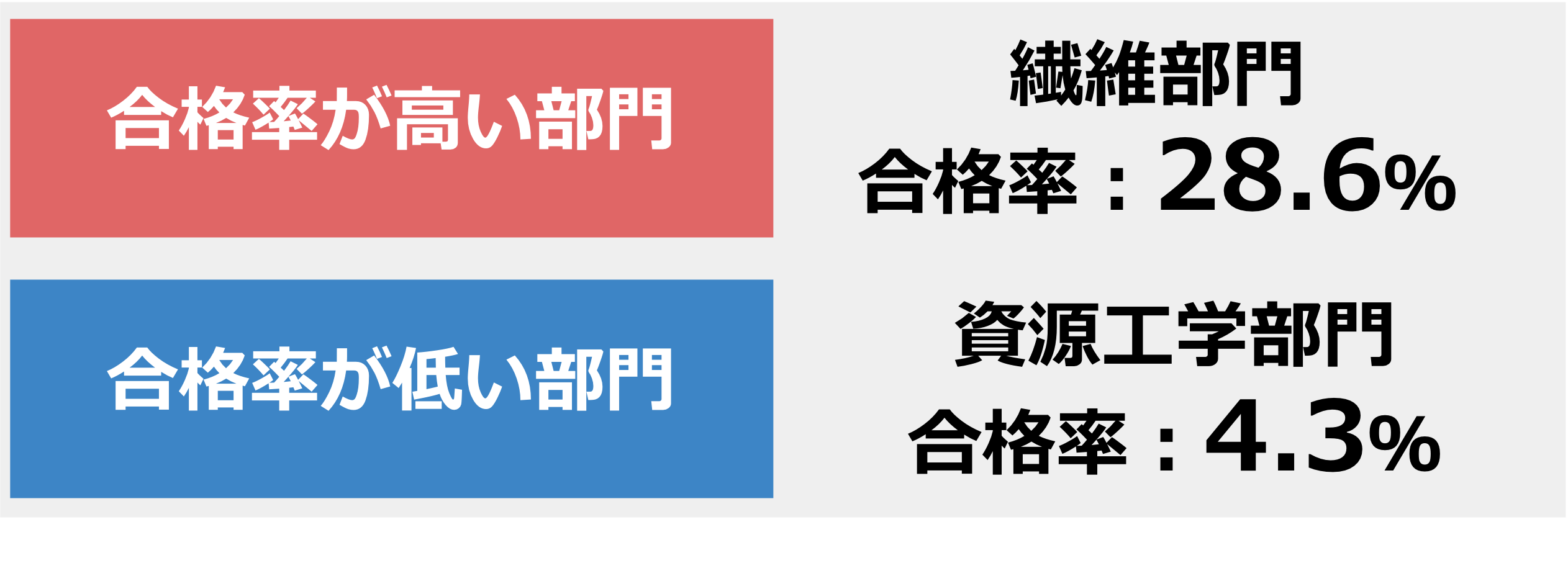 一方で、資源工学部門の合格率は4.3%と、最も低くなっています。