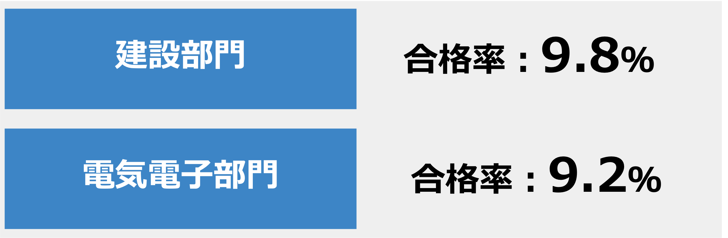 また、受験者数の多い建設部門と電気電子部門の合格率を見ると、どちらも10%を下回っています。